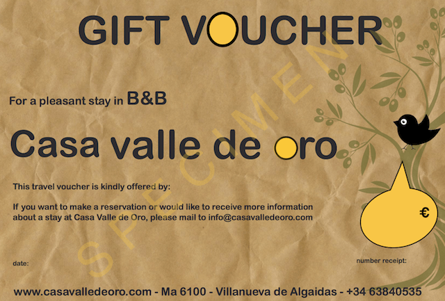 A Bed and Breakfast gift card always makes a perfect present for a travel lover! Treat a friend or loved one to a gift voucher of Casa Valle de Oro and let them spend the night stylishly in one of our lovely accommodations. As giver of this present you enjoy a 5% discount when you make a reservation for yourself at our Bed and Breakfast Casa Valle de Oro. If desired, we will send this personalized gift certificate, which is valid for two years, to the happy recipient.