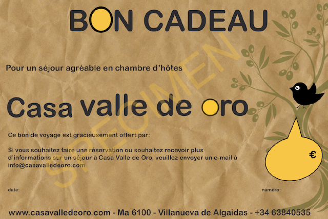 En tant que donateur de ce cadeau, vous bénéficiez d'une réduction de 5% lorsque vous effectuez une réservation pour vous-même à notre Bed and Breakfast Casa Valle de Oro. Si vous le souhaitez, nous enverrons ce chèque-cadeau personnalisé, valable deux ans, à l'heureux destinataire.