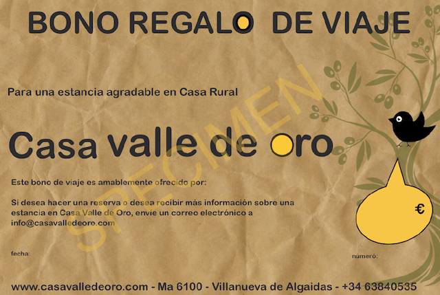 Como donante de este regalo, usted disfrute de un descuento del 5% cuando realiza una reserva en nuestro Bed and Breakfast Casa Valle de Oro, por su mismo. Si lo desea, le enviaremos este bono regalo personalizado, que es válido por dos años, al destinatario feliz.